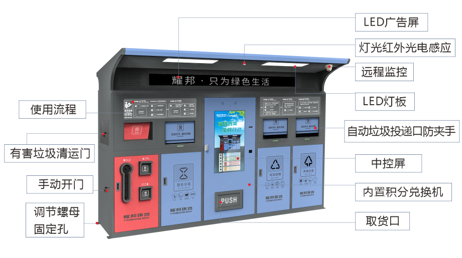 耀邦環(huán)境智能分類設(shè)備內(nèi)置積分兌換機(jī),依托先進(jìn)的人工智能、大數(shù)據(jù)、物聯(lián)網(wǎng)、云計(jì)算等技術(shù),對垃圾分類各環(huán)節(jié)進(jìn)行智能化管理。