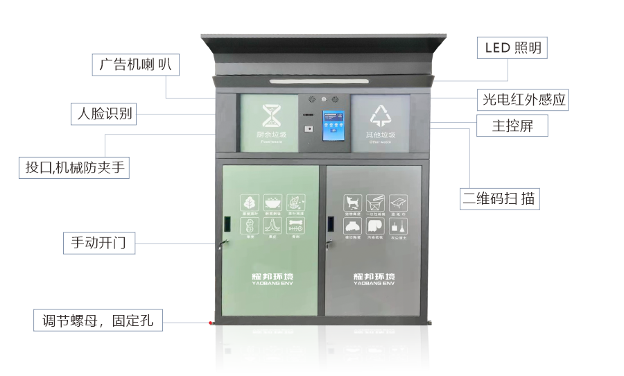 耀邦環(huán)境智能垃圾分類回收設(shè)備,依托最先進(jìn)的人工智能、大數(shù)據(jù)、物聯(lián)網(wǎng)、云計算、AI等技術(shù),對垃圾分類各環(huán)節(jié)進(jìn)行智能化管理。該設(shè)備擁有人臉識別、二維碼識別等多種體驗方式,配置自動稱重、智能投遞、便捷照明、煙霧報警等功能。自主研發(fā)生產(chǎn)、外觀精致時尚、科技感爆棚,引領(lǐng)垃圾分類新潮流。